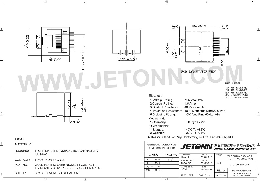 東莞市捷通電子科技有限公司主營貼片式RJ45連接器等其他它精密連接器,我司擁有專業的生產設備和技術型人才,我們堅持匠心品質,持續改進,為客戶提供滿意的產品,歡迎廣大客戶前來咨詢:0769-81886480